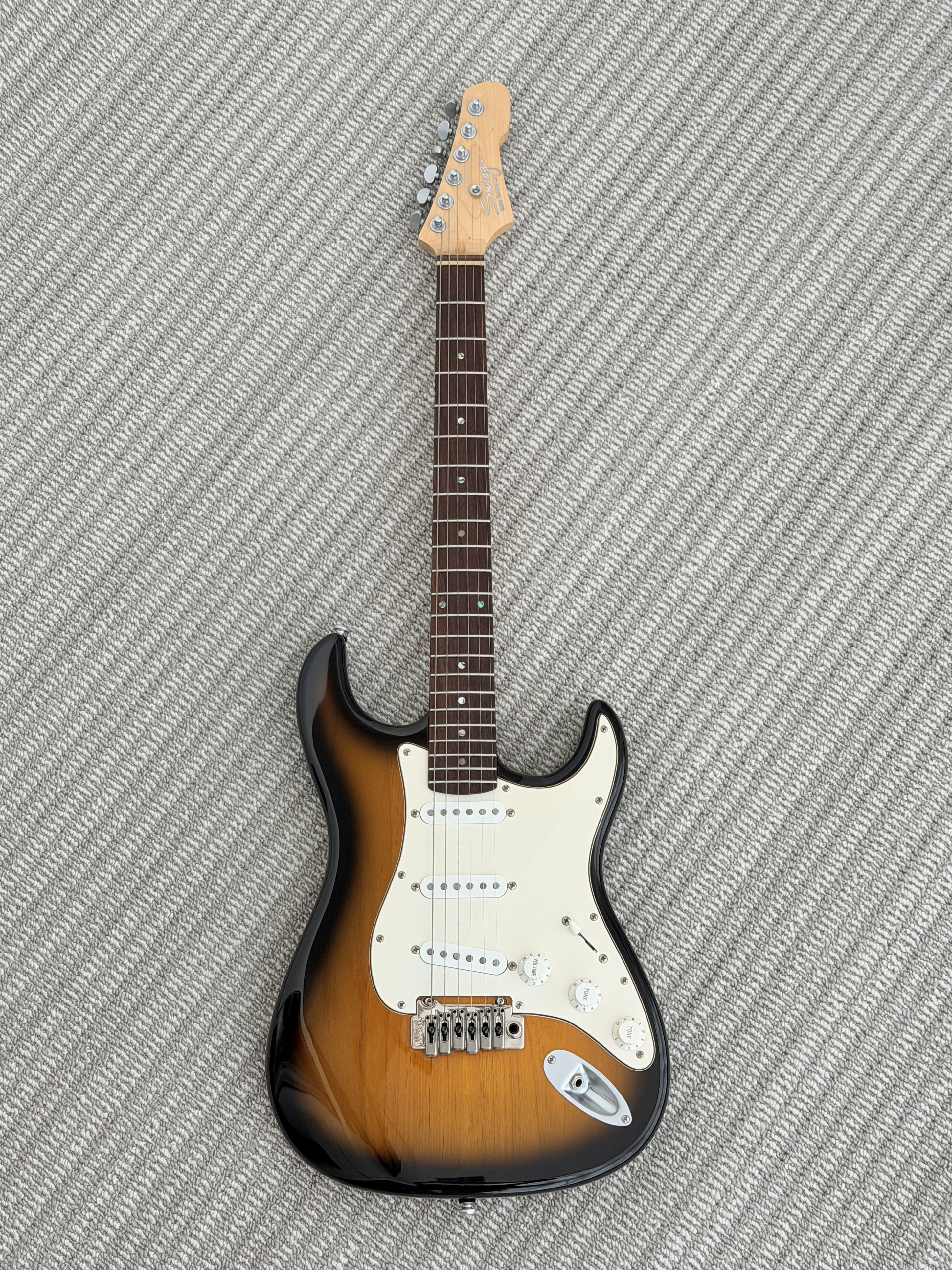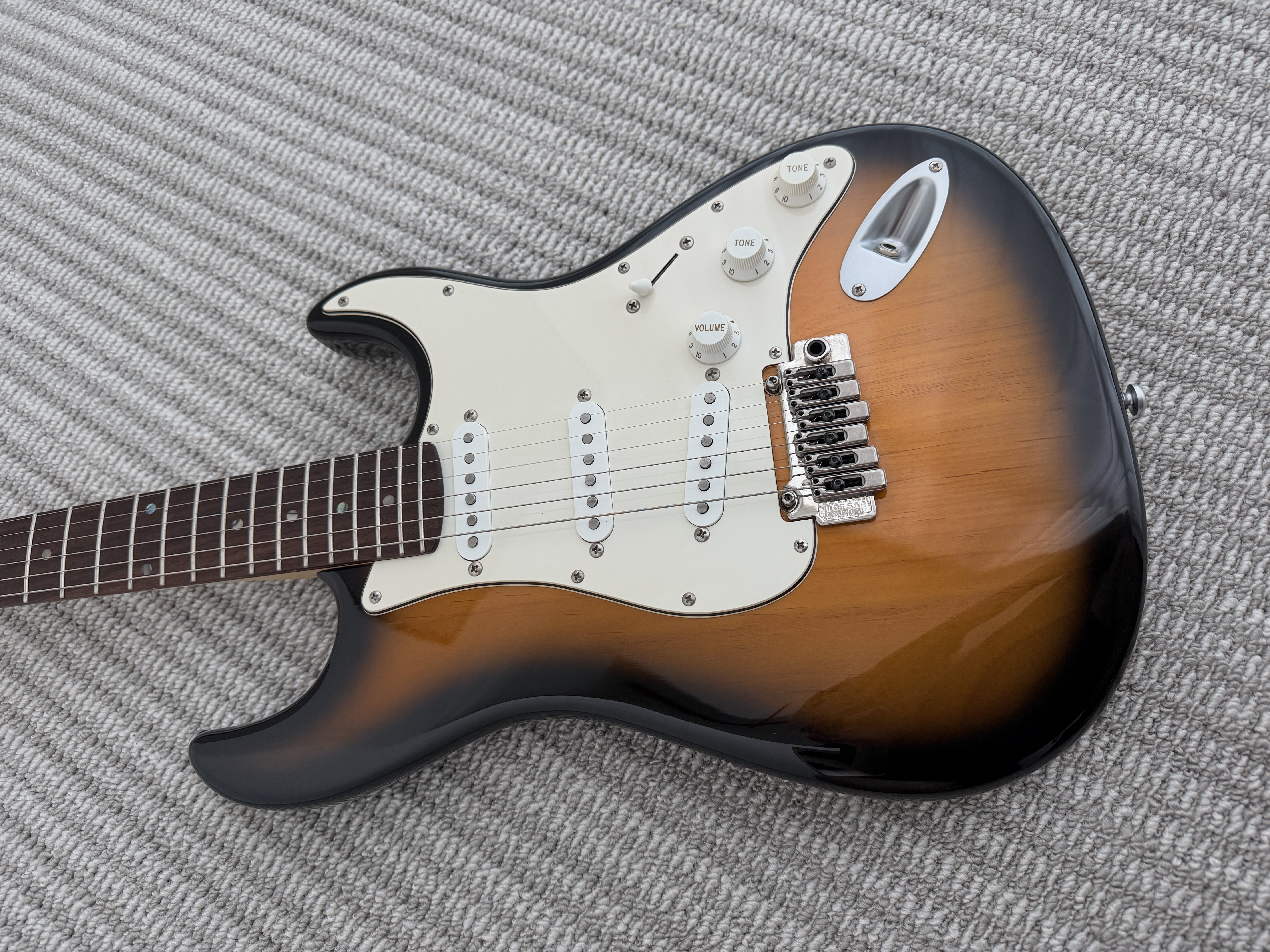 The Swing R-2 2TS/R features an SSS Alnico pickup configuration, an alder body, and an Indian rosewood fingerboard. It has a smooth maple neck, Grover machine heads, and a Wilkinson WVS50II tremolo bridge. The tremolo arm is included. Made in Korea.